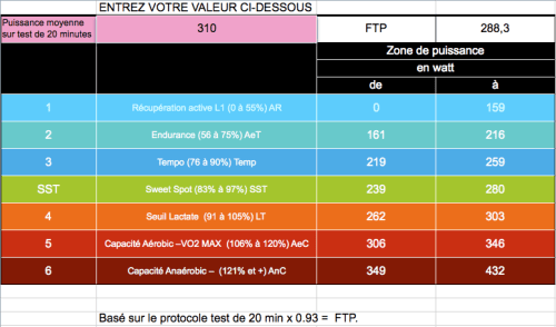 Voici le fichier que je me suis confectionné récemment! Comme vous le savez il est important de connaître votre FTP (puissance maximale moyenne que vous êtes capable de tenir sur 1h) afin de pouvoir déterminer vos zones d’entrainement.