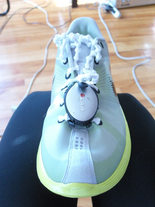 Donc pour l’installation, il faut réussir à faire passer le noeud dans les trous de votre chaussure… En fait, j’ai eu beaucoup de difficulté à faire passer le premier noeud dans le trou… Là j’ai commencé a douter en me disant, bon bon les lunaracers doivent avoir des trous plus petits que la moyenne… finalement, je commence à forcer… et le lacet se laisse finalement déformer pour rentrer (la video de Xtenex montre que je suis un idiot qui aurait du lire les instructions). Je commence à comparer l’installation de ces lacets à des boyaux!