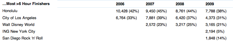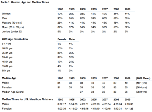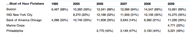 Surtout, regardez la dernière partie de ce tableau… et oui en 30 ans… les hommes et les femmes sont devenus 45 minutes plus lents… Pourtant, on a soit disant des meilleures méthodes d’entrainements, des meilleures chaussures et pleins d’autres aides technologiques… La réalité c’est que le sport est devenu de plus en plus un sport de participation. En 1980, il y avait 143 000 coureurs, et en 2009 467 000 soit pratiquement 3 fois plus…