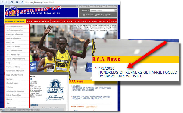 Alors voilà, le 1er avril, le site MYBAA.org (pastiche du site officiel du marathon de boston étant baa.org) a annoncé des nouveaux temps de qualification pour le marathon de Boston 2010… Cela a créé une véritable panique chez les coureurs souhaitant se qualifier pour Boston 2011! Le temps passant de 3:10 à 3:00… pour le groupe d’age 30-34…