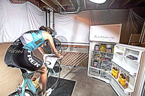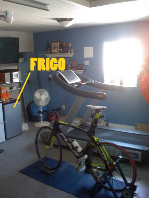 J’aime toujours voir les salles de tortures des triathlètes pro… et j’ai remarqué un truc… ils ont des frigos dans leur salle et je me suis toujours demandé pourquoi… (comme ici, espace de Matt Reed).