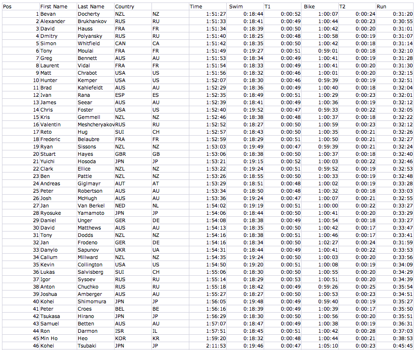 Pour la course des hommes, ce fut une très bonne course de Simon Whitfield qui a terminé 5 ième. Il a la réputation d’être l’homme qui se présente uniquement pour les grandes occasions. Les langues sales comme moi étaient convaincues qu’il allait faire de la figuration surtout après la récente naissance de sa fille, enfin Simon vient de prouver qu’il est encore là! Par contre, je reste encore très déçu que Team Canada n’ai pas été capable d’aligner plus de deux athlètes au départ… la France a placé 5 athlètes et 3 ont été capables de terminer dans le top 10.