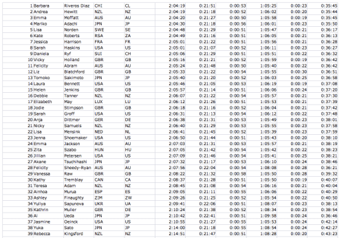 Pour la course des hommes, ce fut une très très grosse déception que Lauren Groves et Sweetland se soient blessées. Tous nos espoirs étaient sur Kathy Tremblay. Elle était bien dans la natation, et sur le vélo, elle semblait même trop bien! Pourquoi je dis cela? Tout simplement parce qu’elle a sûrement perdu trop d’énergie à rester à l’avant du peloton. Aussi, on ne peut qu’être déçu de sa CAP quand on connait son potentiel. Enfin, je suis certain que Kathy va se relever la prochaine fois!