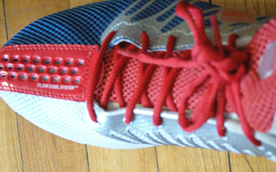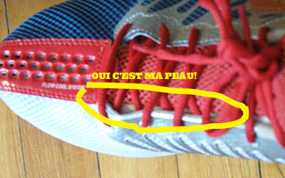 Le seul point négatif sur ces chaussures est esthétique. La chaussure comporte deux systèmes en avant et en arrière appelé « FLOW COOL SYSTEM ». Il était important de renforcer la chaussure sur ces parties autant je déteste cette partie de la chaussure. C’est vraiment massif et cela donne une impression que tout le poids réside dans ses deux extrémités! Aussi, des racing-flat est synonyme de simplicité… pas de gel, de système air etc… et malheureusement, il ne réponde pas à cette philosohpie en mettant en avant un système bidon. C’est des trous comme il y en a partout sur le reste de la chaussure! Si faire des trous, c’est devenu un technologie de pointe!