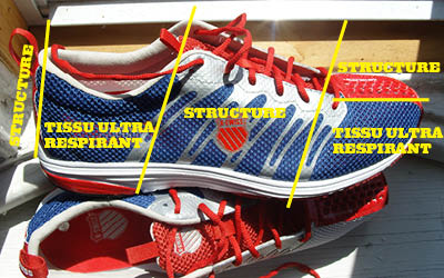 Point de vue structure, elle ressemble a une lunaracer. Elle procure le même questionnement! Comment ils ont fait pour que le tissu reste debout! En fait dans le milieu du pied il y a une structure qui tient le tout (partie grise). De ce fait, la première fois que vous mettez ces chaussures, vous avec presque l’impression de porter des sandales! la seule surface de contact semble être la semelle. Aussi, la k-ruuz a été conçue pour être utilisée sans chaussettes, la shoebox (espace pour les doigts pieds) a été élargie. Encore une fois pour ceux qui courent en racing-flat (chaussures généralement très fines et pour pied fin), ce surplus d’espace surprend! (acheter ses chaussures une demi-pointure peut-être conseillé).