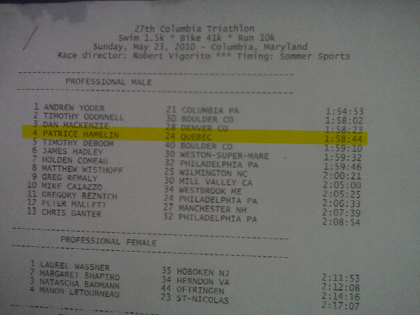 Patrice Hamelin est l’homme qui gagne TOUTES les courses au Québec. Il a eu la bonne idée de se confronter aux meilleurs triathlètes. Hamelin est dans la même minute que Timothy O’Donnel (champion du monde longue distance ITU, champion Ste-Croix 70.3). Patrice finit aussi devant Tim DeBoom (ex-champion Ironman)!