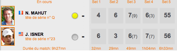 Il était 9h du matin… et Mahut et Isner commençaient le 5ieme set. 7h plus tard, ils y sont toujours… non vous ne révez pas… c’est bien 59 à 59 dans le dernier set… un set de 7h, ils viennent d’arrêter à cause du manque de lumière (nah!). Va falloir revoir les entrainements de tennis en conséquence!!!!