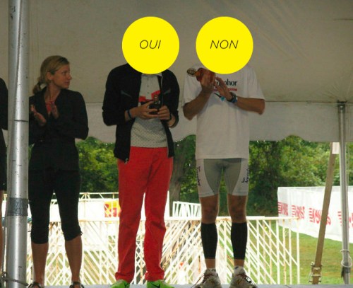 Comme vous DEVEZ le savoir. Les Trimeux répondent à un code d’éthique. Je suis nouveau dans le triathlon, et je suis toujours étonné par les remises des prix… Tu t’entraines pendant des dizaines d’heures à l’année longue, alors cela devrait être la cerise sur le gâteau et non, personne n’excise un sourire ou montre un peu de fierté. En fait généralement, même dans ces événements, le triathlète à le besoin de montrer qu’il est triathlète… en montrant ses magnifiques bas de compression pour lui permettre de monter plus vite sur le podium. Nous, on préfère se changer après une course, sachant que tu dois attendre que notre grand mère termine sa course! Et on préfère porter notre fluo en signe de reconnaissance avec notre mafia.