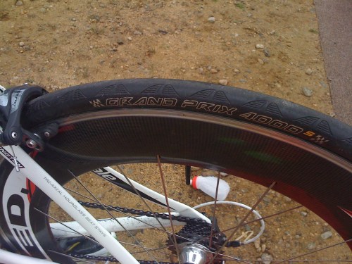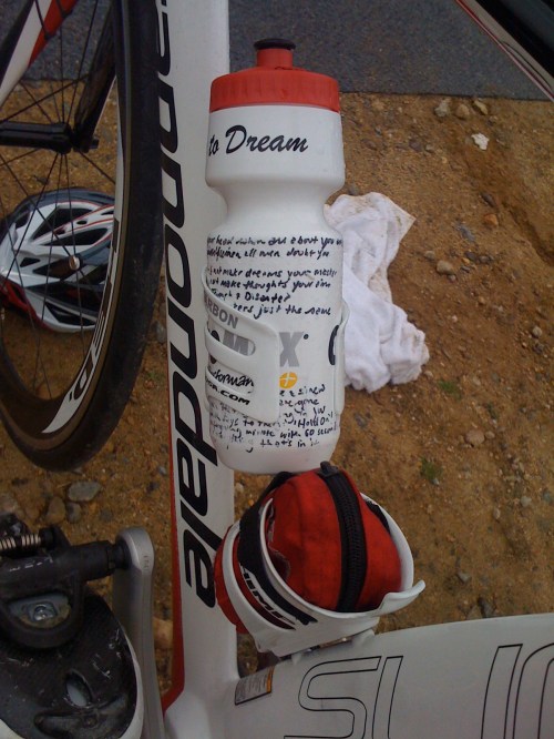 Chrissie est reconnue pour être la fille la plus rapide en vélo (enfin elle s’est fait battre par Angela Naeth à Timberman) et d’avoir très peu de talent pour conduire son engin. Nous avons pu approcher son vélo, et alors? Aucun powermètre, du shimano dura ace de base, des pneus continental de base (grand prix 400). Fait intéressant, elle a un kit de réparation dans son porte bidon. Mais ce qui est le plus fascinant dans tout cela, c’est son bidon! Et oui, il y a tout un texte inspirant écrit dessus à la main! Est-ce qu’elle prend le temps d’emmener de la littérature pour son vélo sachant qu’elle a largement le temps de gagner de toute façon.