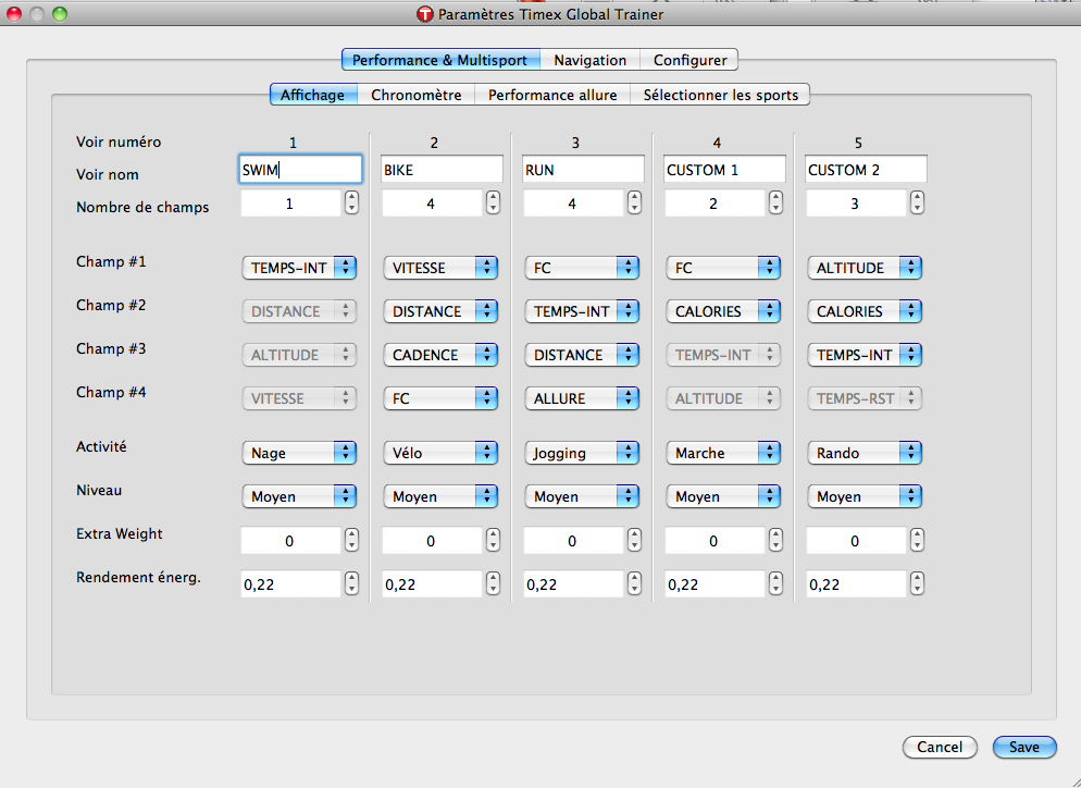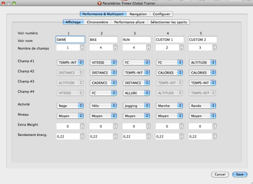 Son écran est totalement configurable, vous pouvez affichez jusqu’a 4 champs et vous pouvez les changer assez rapidement et facilement à partir de la montre.