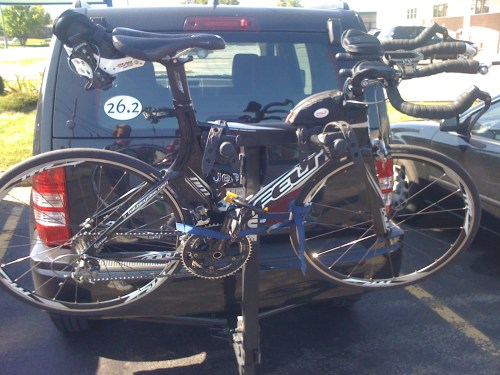 Au passage, voici le plus petit vélo de triathlon vu de mes propres yeux. Fait ironique, il est justement trop petit pour la personne en question! selle le plus en arrière… 1m de spacers en avant.