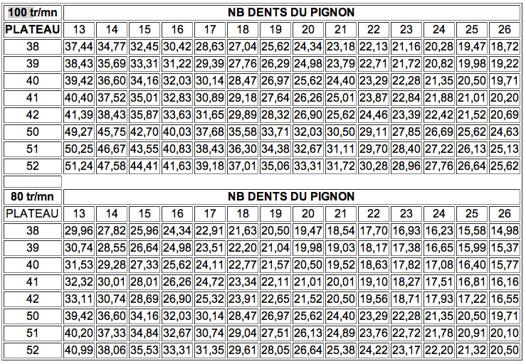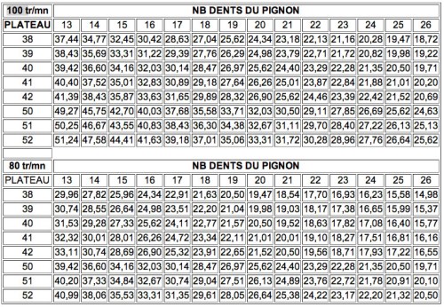 pour une fréquence de pédalage de 100tr/mn et de 80tr/mn