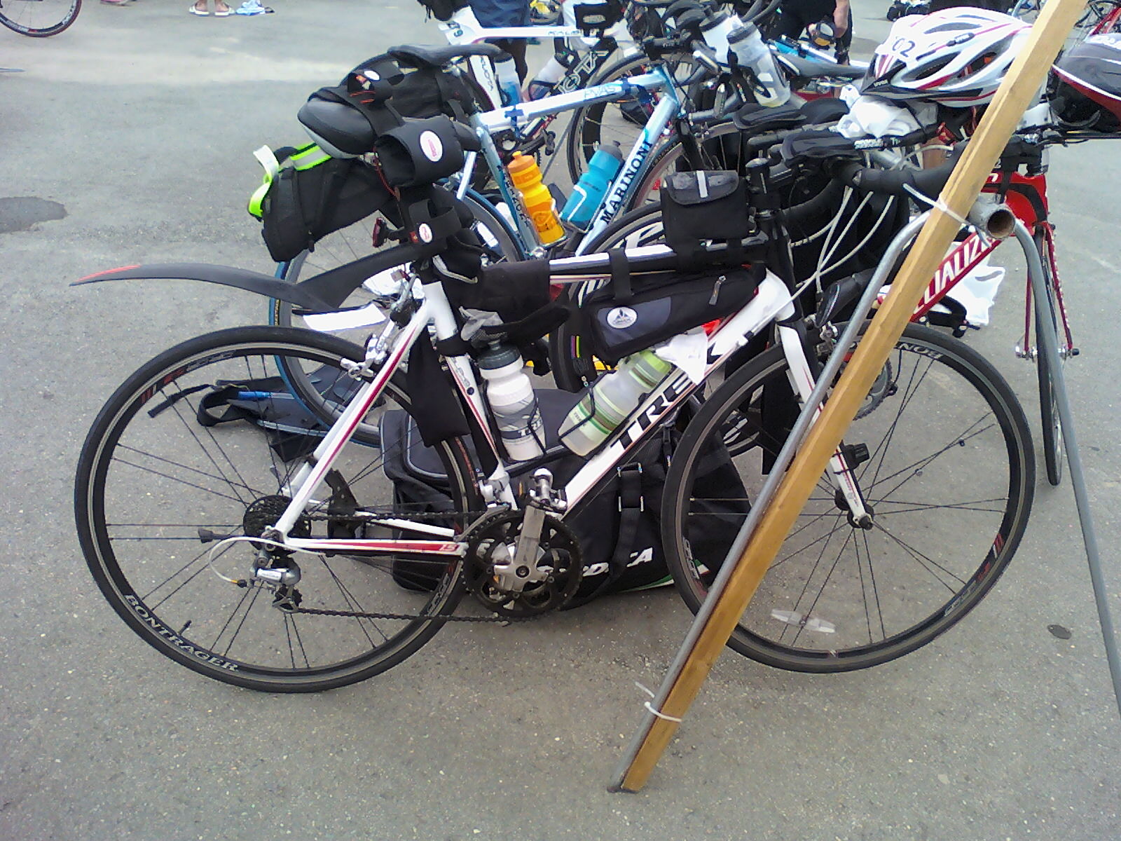 Deuxième étape, se rendre dans la zone de transition, mais je me fait interdire l’accès en me faisant dire de revenir une heure avant mon départ car la zone est pleine, donc trop petite pour un événement de cette ampleur. Malgré que les zones de transition ne sont pas toujours surveillées parfaitement, c’est quand même une place de parking sécuritaire à mes yeux. De mauvais poil, je fouille dans mes valises, le vélo étendu parterre me changeant pour faire mon réchauffement de vélo parmi tout les passants, spectateurs, compétiteur. C’est pas la mort mais c’est loin d’être l’idéal.